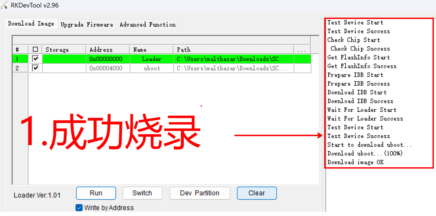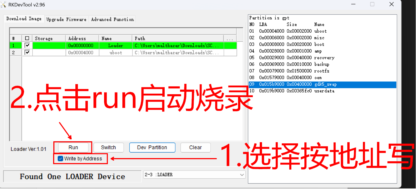 设置好分区的烧录信息后,在瑞芯微烧录工具的界面点击Write by Address,然后点击Run,开始烧录。