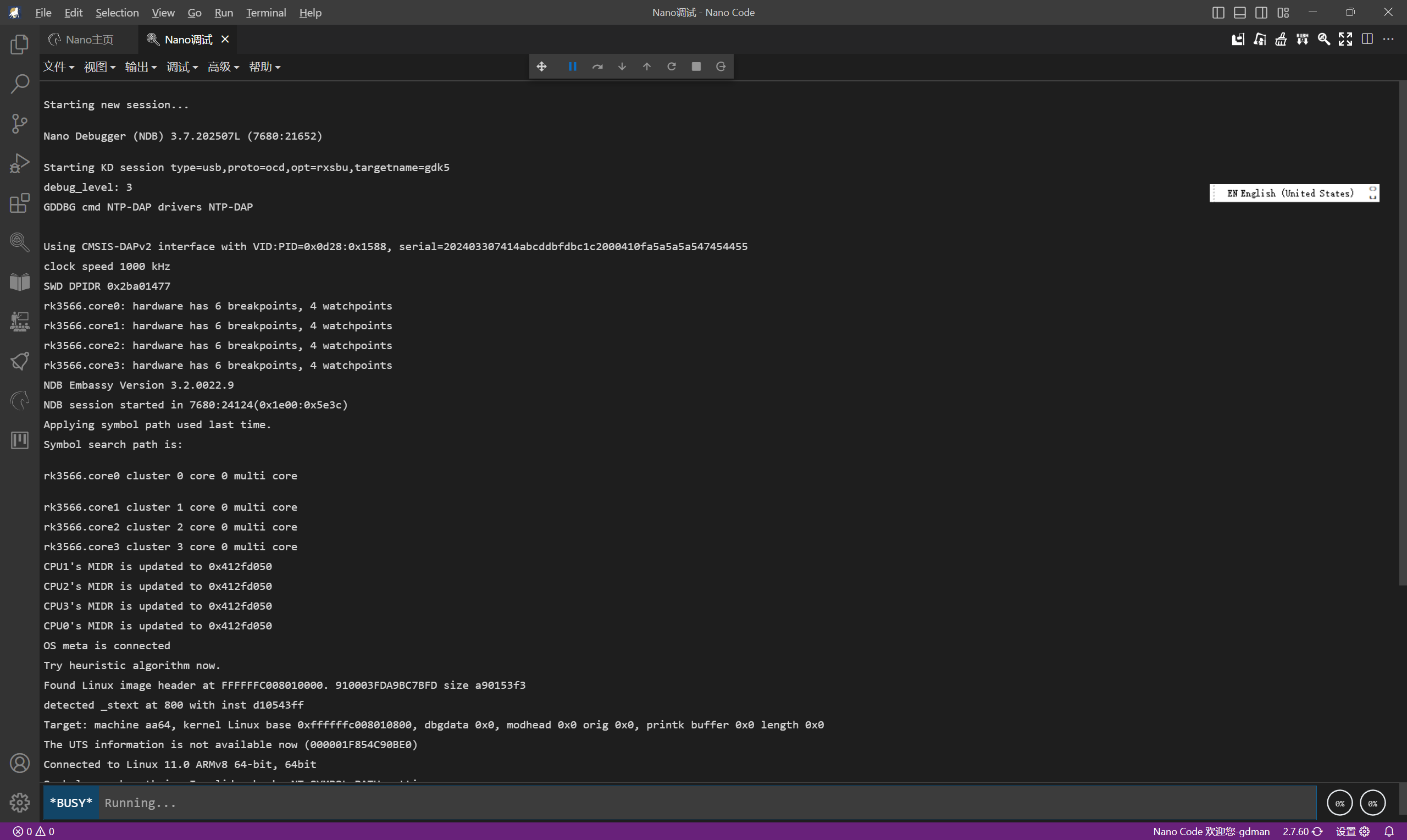 启动调试会话后,NanoCode内置的NDB调试器便会通过挥码枪与GDK5芯片中的CoreSight设施对话,如果一切顺利,那么NDB会显示如下信息: