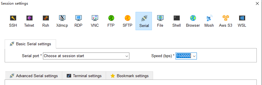 3. 开启MobaXterm,建立串口会话,选择1500000波特率。