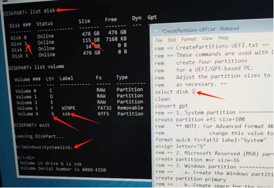 然后直接输入UpdateImage.bat回车,将打开的CreatePartitions-UEFI.txt内的DiskId修改为emmc对应的磁盘序号,也就是前面说的1,修改完成后保存,然后关闭这个文件,等待脚本运行完毕.